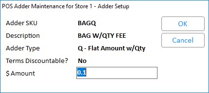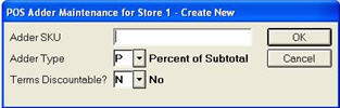 Create an SKU in Inventory Maintenance for each POS Adder. Then use Maintain POS Adders in Options Configuration to add POS Adders. You can have up to 999 Adders. The procedure below assumes you have already set up options for the POS Adders feature.