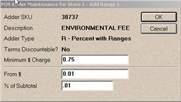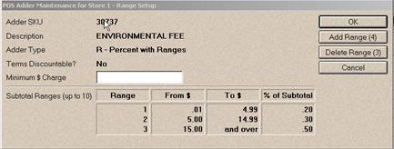 2. Click OK to continue. 3. Click Add Range to add the next range. 4. Based on the subsequent range, the system automatically enters the "From$" field of the previous range. 5. Enter additional Minimum $ Charge, From $, and % of Subtotal for up to 10 ranges. 6. When finished, click OK to submit your ranges. You can click Cancel at any time to discard changes and end the session. Note: If you need to delete the last range you entered, click Delete Range. |