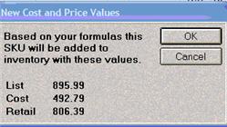 You can use the Recalc button to preview the prices the system will calculate based on the formula you entered in the Retail field. If you click OK, the system pastes the calculated values into the Cost and Retail fields in the add dialog box, and uses the calculated values when adding the item to inventory. If you click Cancel, the add dialog box displays with the formula in the cost and retail fields, giving you the opportunity to set different values.