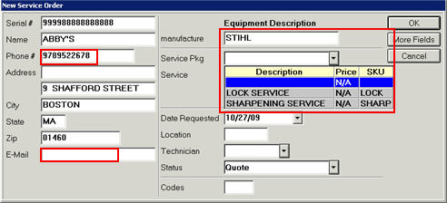 Select a Service Package (the Service Pkg field displays only if you set up one or more service SKUs), or enter a description of the service in the Service field. If you do select a Service Package, you can still enter something in the Service field if desired (for example, any additional information about the service or repair).