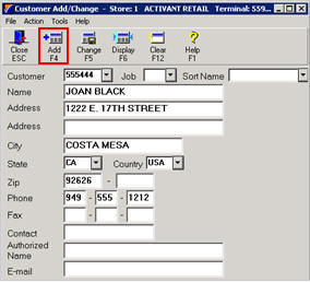 If you use Customer Quick Add and you want to add a customer account, press Add Customer, fill in the information and click Add. After the customer is added, press Close to close this dialog. The system returns to the service order header to allow you to enter the serial number. If you entered the serial number before pressing Add Customer, then you will be returned to the service order header, ready to enter the equipment description. Customer information automatically pastes in from the Customer Add dialog.