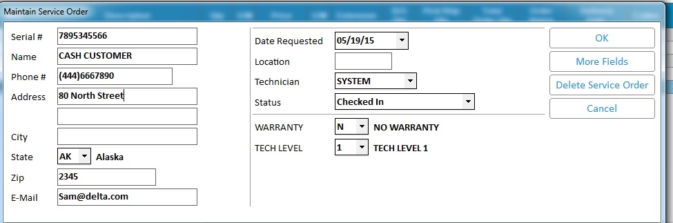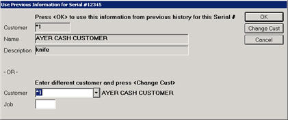 Note: If you enter the Serial Number of an item that you have serviced before, or that was purchased in your store, the system displays a dialog in which you can change the customer, or press OK to use the information from the previous transaction for this item.
