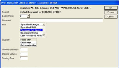 Note: To print Service Order labels for tagging items to be serviced, select the label print option "Package ( no items)"