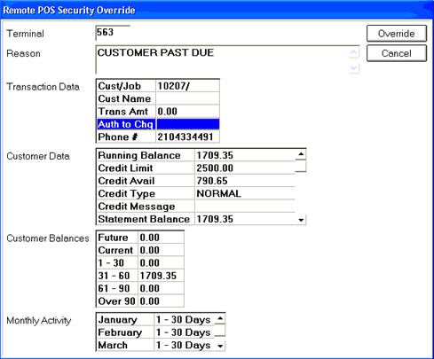 When a clerk attempts to execute certain actions in POS, a manager's override may be required for that action. For example, a clerk might need a manager override to ring up a sale for an account that is past due. Whether or not an override is required depends on the action being performed and the security level of the clerk. Click here for more information about security.