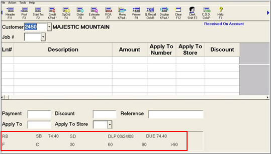 Note: Notice that the bottom of the screen gives you a thumbnail view of the account, including Running Balance (RB), Statement Balance (SB), Statement Discount (SD), Date of Last Payment (DLP), and aging buckets (Future, Current, 30 days past due, etc). The Due amount is calculated from the Statement Balance – Statement Discount; it does not change if the account goes past the discount date.