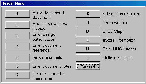 The Header Menu displays when you press menu on the Header Screen or if your cursor is in the Customer Area of the Posting screen.