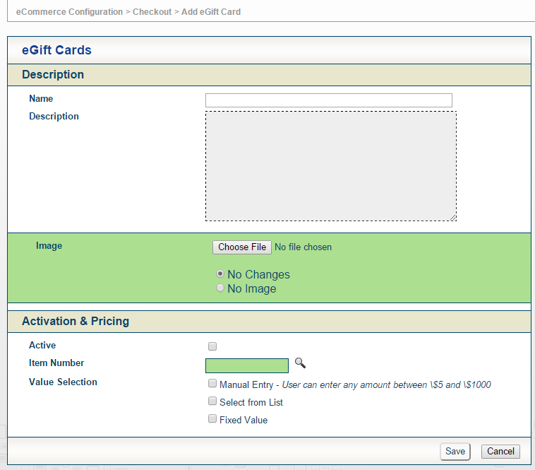 To set up an eGift Card, select a Name and Description for the card. Both the name, description and image (image is optional). These values will display on the eCommerce site and will also be part of the email to the recipient.