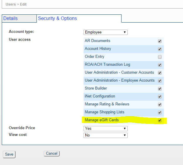 A new iNet security profile will allow employee (Admin) accounts to “Manage Gift Cards”. It will allow employee user to control access to the gift card purchase history page and resend gift card ability.