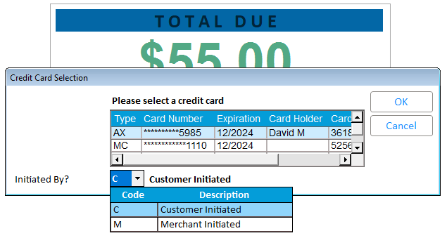 Additionally, when clerks selects a stored credit card from the Misc. Menu > Credit Card option in the POS Totals dialog box, then they must use the Initiated By drop down to select if the transaction is merchant initiated or customer initiated. The system can then send the appropriate card-on-file indicators with the authorization request. The default is Customer Initiated.