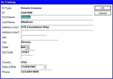 If the customer is purchasing a pseudoephedrine item for the first time, but does not have an account on file in Customer Maintenance, manually fill in the dialog, and then press OK.