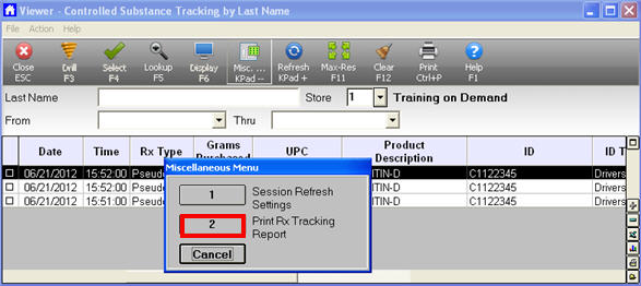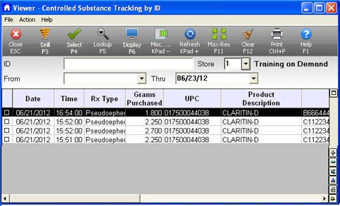 To use the Controlled Substance Tracking Viewer, you must have security bit 949 "Access Controlled Substance Tracking Viewer." In this viewer, you can look up pseudoephedrine and other controlled substance records by Customer ID, Last Name, Phone Number, or Transaction Date. You can also print the items in the grid, which will include the customer's signature.