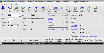 Enter the quantities received in the New Rcvd Qty column, and if necessary, change any costs in the New Cost column. Click Change.