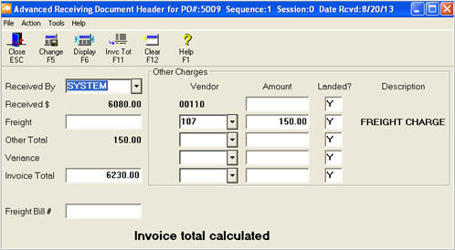 Note: If you are correcting posted freight from a previously closed document (changing a value for the same vendor already existing in Other Charges), the system updates and creates a new voucher to that vendor for the difference, because the system assumes the freight has already been posted and paid in A/P.