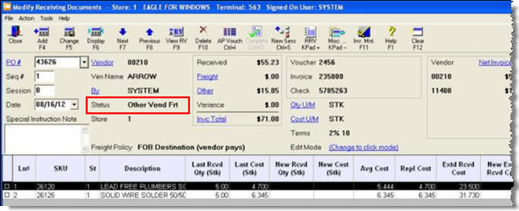 Once you close the Header dialog and return to the detail dialog, note that when you enter an Other Charge amount, the document's Status field changes to "Other Vend Frt."