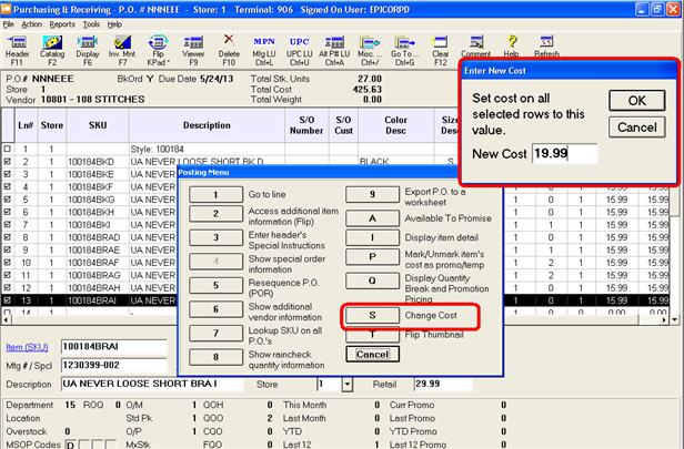 Use this procedure when you need to update many items with the same cost. For example, if you have Style-Color-Size, you can use this method to update the cost of an entire Style. Note: This procedure only applies to status “F” purchase orders, not to purchase orders being received (status R).