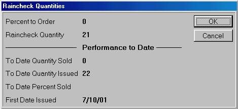 Click Show Raincheck Quantity Information. A dialog box displays the quantity information for the item's raincheck(s).