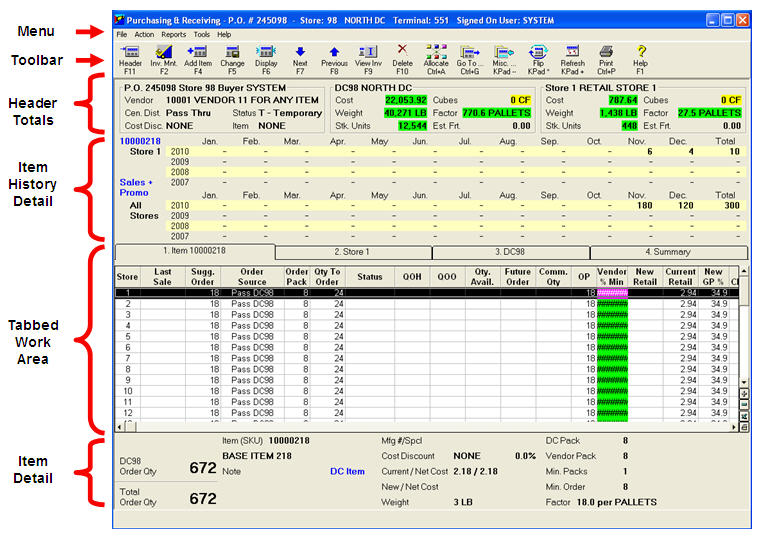 The Purchase Order Worksheet contains the five basic areas shown below. Click the name of the area for more information about that area.