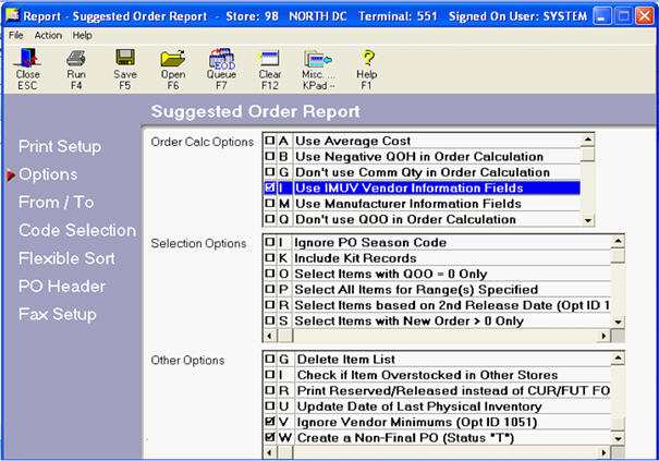 Order Calc Options – You should always use option I-Use IMUV Vendor Information Fields when generating an order that is creating a central distribution purchase order. This tells the system to use the alternate vendor field values when generating the purchase order, and only the alternate vendor contains the additional fields that are necessary for a central distribution order.