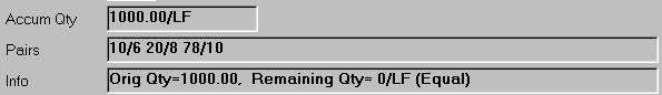 Use the Accum Qty and the Info fields to help you verify you have entered all length/quantities correctly. In the following example, all 1000 feet that were ordered have been accounted for, as indicated by the Remaining Qty of zero lineal feet (0/LF).