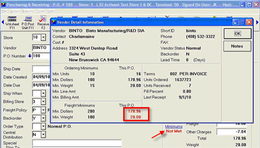Purchasing and Receiving Header screen – Not Met displays below the Minimums hyperlink if the PO doesn’t meet either the vendor’s Ordering Minimums or Freight Minimums. The minimums which haven’t yet been met display in red in the Vendor Detail Information dialog.