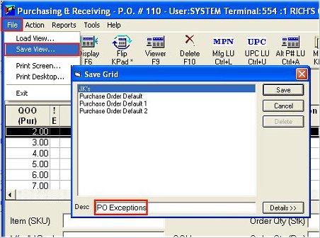 Use the following procedure to set up a grid "view" for the Purchasing and Receiving window that includes the PO Exception fields, so your purchasing clerk(s) can review these fields before submitting a purchase order to the vendor. If desired, you can make this view the default view for the purchasing clerk(s), so the view will automatically display whenever he/she displays the posting screen in the Purchasing and Receiving window.