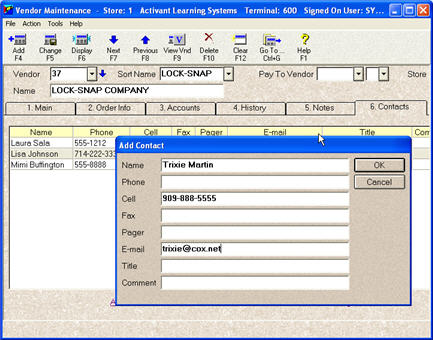Use the following procedure if you want to set up a list of contacts for your vendors. In the list, you can specify information about the contacts such as their Phone #, Cell #, Fax #, Pager, Email Address, and Title, and you can also enter any comments in the Comment field.