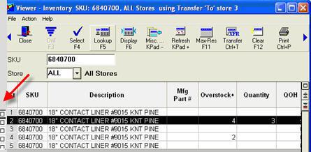 In the Store field, enter the store number of the store needing the item, and press Viewer (F9). The Inventory Viewer displays, with the Transfer "To" store included in the Title bar.