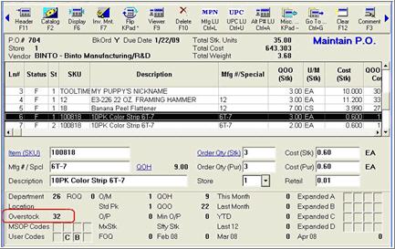 Type an SKU that needs stock quantity filled in this store, and press Enter. Notice that the "Overstock" quantity displays near the bottom of the screen.