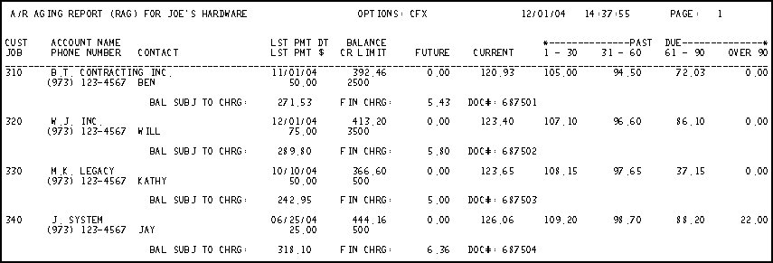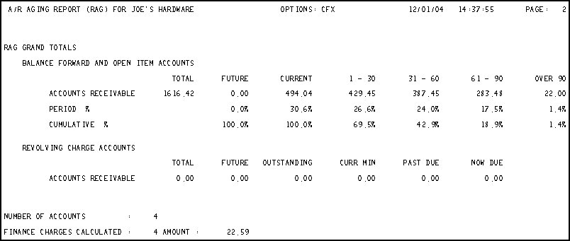 Finance Charges Calculated— The total number of F type documents calculated by this RAG report. If the report was run with Option F, then it is also the number of F type documents added to the Open Item file.