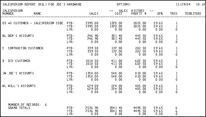 This topic provides an example of the Salesperson Report (RSL) and definitions of the fields on the report. For more information about RSL and procedure steps for running the report, click here to go to the online help topic. This report is available from both the Eagle Browser and Network Access.