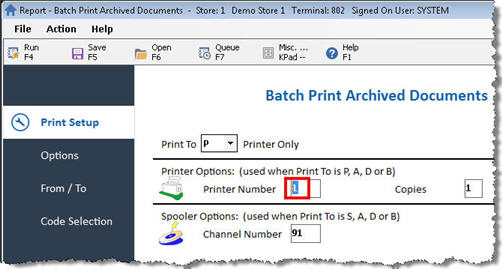 From the Eagle Browser, type QRPRINT in the Launch bar, and press Enter. Alternatively, you can click Reports-->POS Reports-->Batch Print Archived Documents.