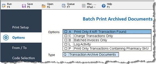 On the Options page, select the option that reflects what you want to print on the report: Only A/R transactions, Charge Transactions, Batched Invoices (PPS / Customer Order Management users), Log Activity, or only Transactions with a Pharmacy SKU.