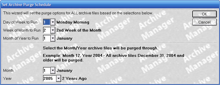 For example, if you want to run the purge on a Monday of the second week of January, your screen would look like this: