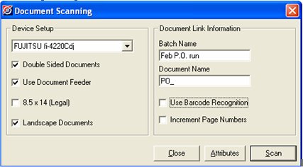 If you need to return to the Attributes dialog, click Attributes. When finished changing the attributes, click Scan to return to the Document Scanning dialog.