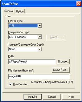 From the Scan menu, click Select To File. The ScanToFile dialog displays. Set Files of Type to TIFF, set Compression to CCITT Group4, and set the Path to c:\3apps\temp. Leave the default settings in the other fields.