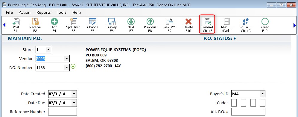 Important: The Purchase Order must be status "F" in order to use the <Transmit> button.
