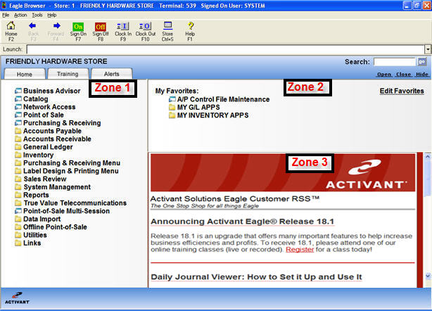 You can launch an application from Zone 1. Notice that the Browser uses dynamic nested menus that allow you to drill down to menu items and remain on the same screen.