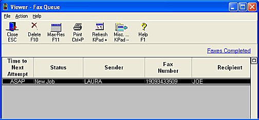 To display completed faxes, click the "Faxes Completed" link above the grid. The Faxes Completed Viewer displays. The Status column indicates whether the fax has been sent successfully, failed to connect, or was cancelled because you deleted it in the Fax Que Viewer. The Request ID is simply the sequence in which the fax completed in relation to the other completed faxes. For your convenience, completed faxes are listed from most recent to oldest.