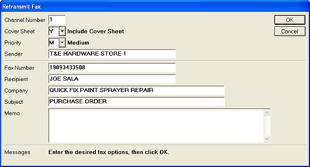 When finished filling in the fields, click OK to send the fax. Click OK again in the Retransmit Fax confirmation box.