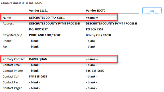 When matches are found, select the row in the grid and click Display to display the Compare Vendor screen for a side-by-side comparison. Click OK to close the window.