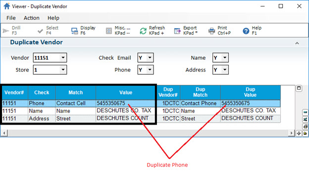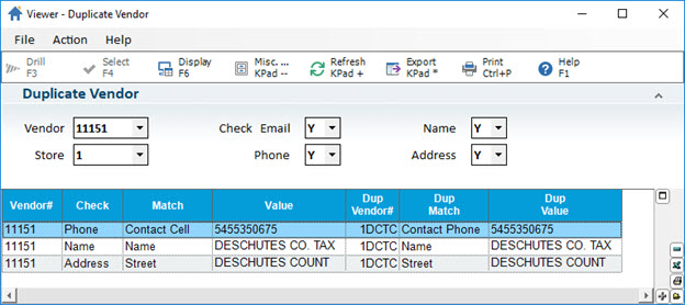 Use the Vendor Duplicates Viewer to view and filter all the possible vendor duplicate records in the system. You can filter by store, vendor, or contact information, such as email or phone number. This viewer is effected by Vendor Maintenance, so adding or deleting a vendor from Vendor Maintenance automatically adjusts this viewer.