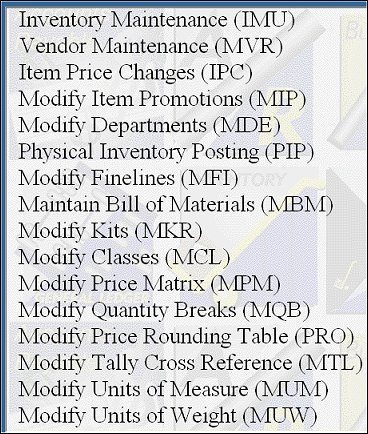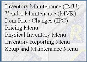 Below is an example of how the Inventory Submenu looks if this option is set to 2. The last four choices in the list (Pricing Menu, Physical Inventory Menu, etc.) are submenus that bring up more selections when you click on them.