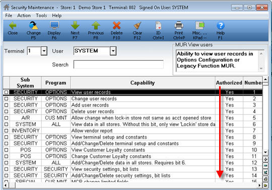 The bits included in the users' security display "Yes" in the "Authorized" column. The bits not included in the users' security display "No" in this column.