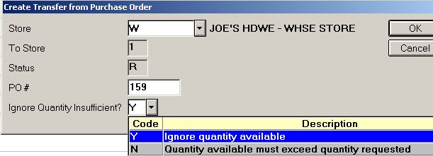 At the From-store, create a transfer from the PO. This store is the From-store on the transfer. To create the transfer, you'll need to PO number. Click here to go to the help topic for creating a suggested order. Once the transfer is created, you can no longer display the PO.