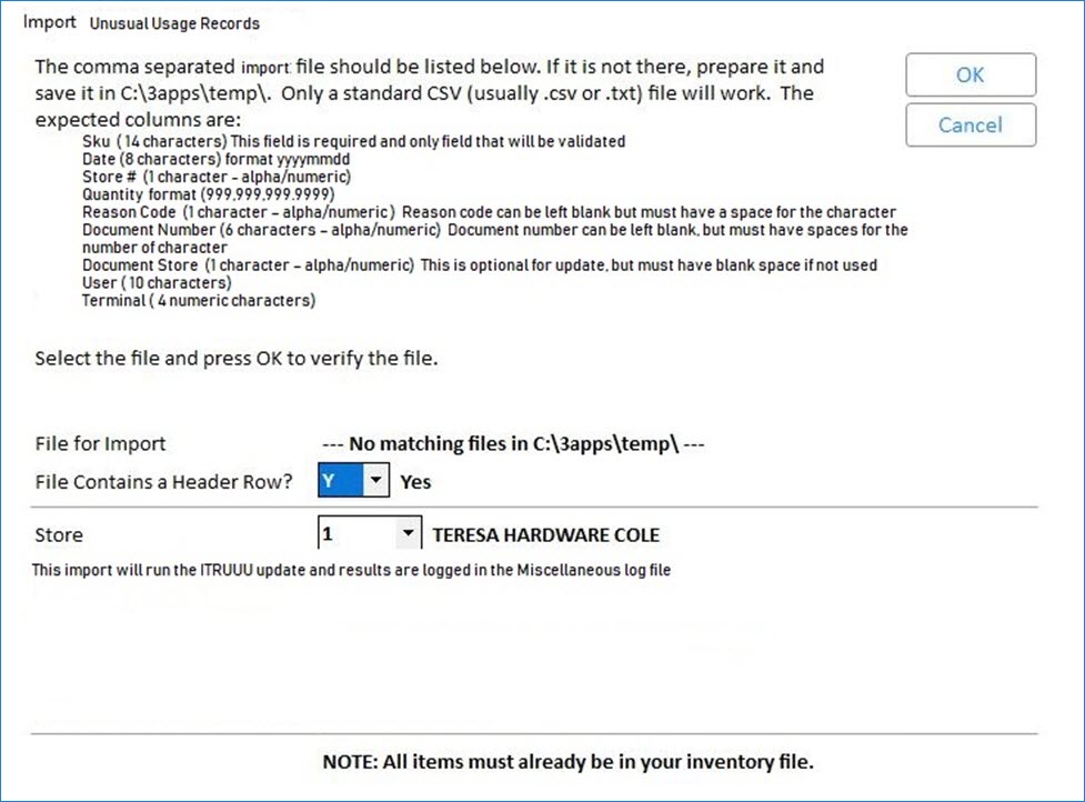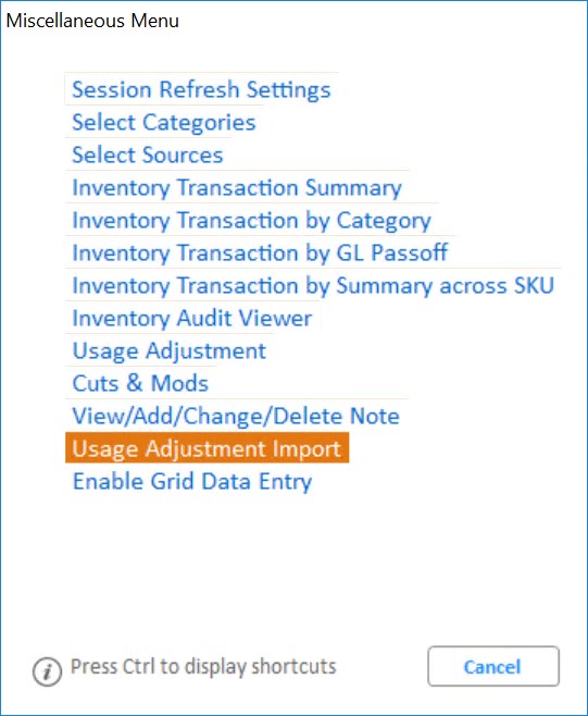 You can import a CSV file containing inventory item change information into Inventory Transaction Register (ITR). The functionality doesn't support negative quantity adjustments. You need to enable D Option on the ITR Miscellaneous Menu to post the adjustment manually.