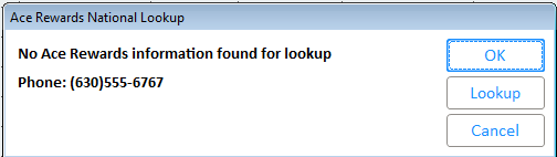 If the phone number entered for National Lookup is not found, clicking on the <Cancel> button exits the Ace Rewards lookup process and takes you back to POS.
