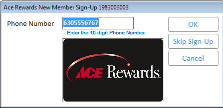 Note: If the customer does not have an Ace Rewards card, and opts to sign up to the program, then the New Member Signup process will remember if a phone number had been previously entered in the Ace Rewards Lookup process. The phone number displayed can be accepted, changed by the clerk or by the customer on the PIN pad.