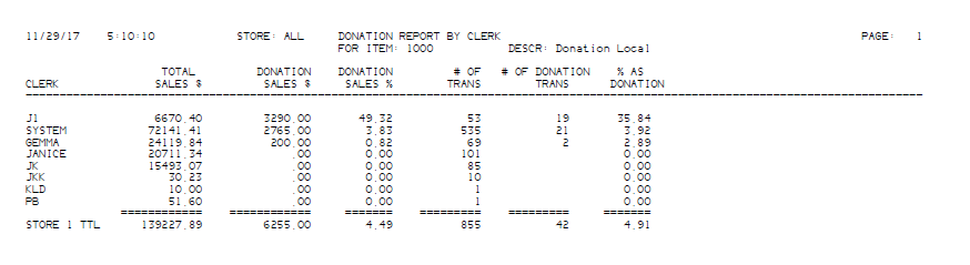 Note: To use a different SKU for the donation totals enter that SKU in the”Sales for This SKU” field. Print ‘This item Sales’ by Cashier - select Report Type T “This Item Sales” and enter the SKU to report on in the “Sales for This SKU” field.