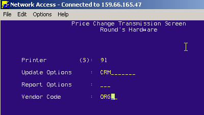 You’ll get either a “transmission successful/unsuccessful” message when the transmission is complete. If successful, the new prices are placed in the price change file. You can obtain more information about the status of the transmission in the Async Transmission Log (ASYMSG).