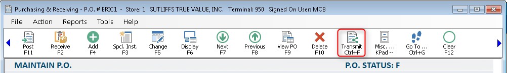 Function EPO can be accessed from the menu, or by clicking on the <Transmit> button in Modify Purchase Order (MPO)